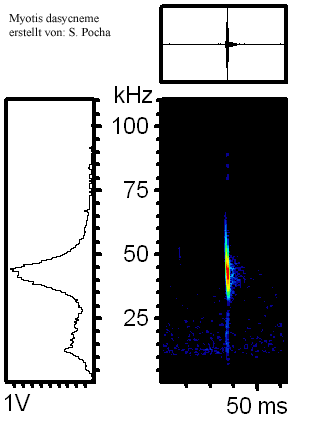 | Auffällige Merkmale: | Mittelgroße Fledermaus. Tragus deutlich kürzer als halbe Ohrlänge, schmal mit abgerundeter Spitze, etwas nach innen gebogen. Ohraußenrand mit 5 Querfalten. Die Füße sind groß mit langen Borsten. Dichtes Fell mit schwarzbrauner Haarbasis, Unterseite weißgrau bis gelbgrau, von der Oberseite deutlich abgesetzt, Oberseite fahl graubraun mit Seidenglanz. Kurze rotbraune Schnauze, Ohren und Flughäute graubraun, lange und breite Flügel. Schwanzflughaut entlang der Unterschenkel fein weißgrau behaart. Rufamplitudenmaximum bei ca. 38 kHz | ||||||||